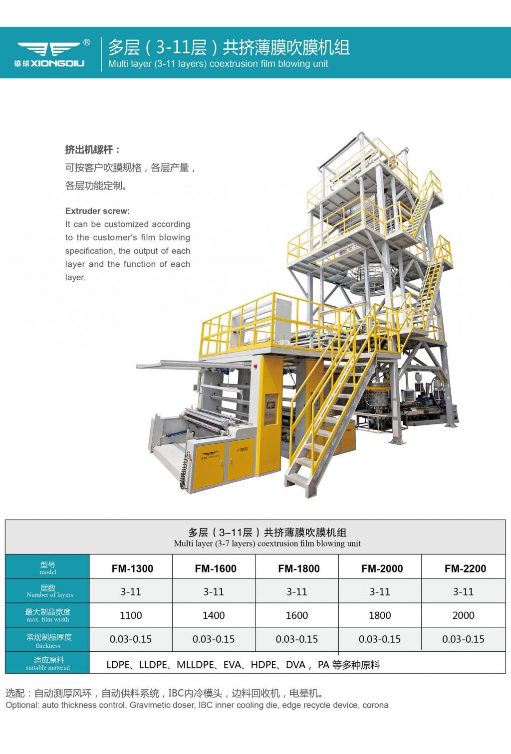 | 多層共擠薄膜吹膜機(jī)擠出機(jī)螺桿(3-11層),可按客戶吹膜規(guī)格,各層產(chǎn)量,各層功能定制。薄膜吹膜機(jī)應(yīng)用領(lǐng)域:PE收縮膜、冷拉伸套管膜 、PE基材膜、食品包裝膜、日用品包裝膜。 |