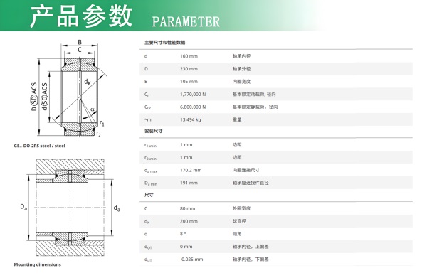安徽捷越倉庫發貨實拍 GE160-DO-2RS-A軸承數據 d內徑(mm): 160 D外徑(mm): 230 B寬度(mm): 105