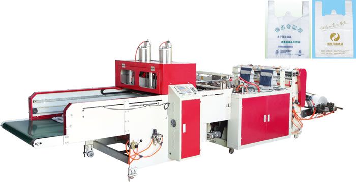 | 該機用于對高密度聚乙稀(HDPE),低密度聚乙稀(LDPE)本色和彩印塑料薄膜 進行熱封熱切制袋,是生產背心袋(馬夾袋)理想的設備。 |
